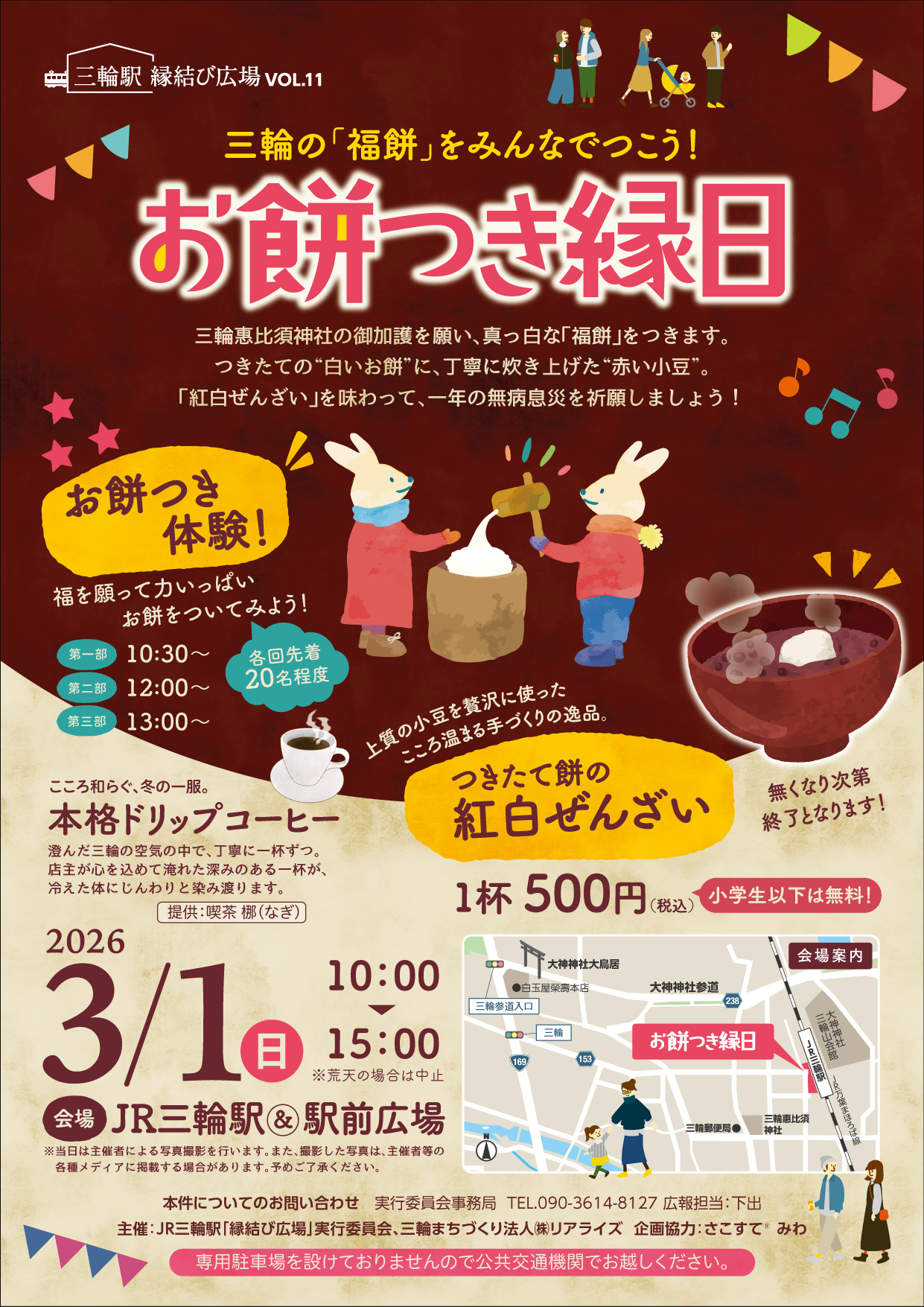 JR三輪駅縁結び広場 Vol.11 お餅つき縁日 開催! JR三輪駅縁結び広場 Vol.11 お餅つき縁日 日時/2026年3月1日(日)10:00〜15:00 会場/JR万葉まほろば線「三輪駅&駅前広場」