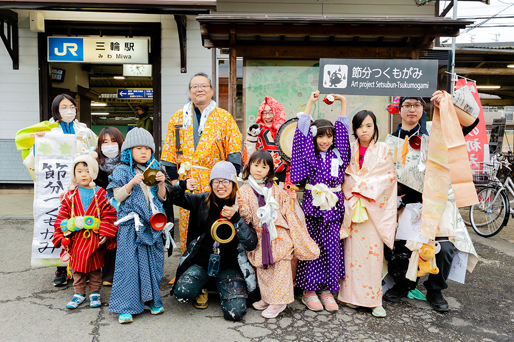 長い年月を経て“モノ”に精霊が宿った「つくもがみ」。大量廃棄社会へのアンチテーゼとして、道具や廃棄物に新たな生命を吹き込むアート表現を行いながら「もったいない」「物を大切に」というメッセージをたくさんの人々に発信していただきました。子どもたちを含む約20名がプロジェクトに参加。午前中のワークショップではそれぞれ持ち寄った素材を身にまとい「つくもがみ」へと変身。午後からはアートパフォーマンスとして三輪の街を巡行し、持続可能な未来のあり方についての問いかけを行うとともに、旧暦の1年の終わりである「節分」にまち全体の厄落としも行っていただきました。